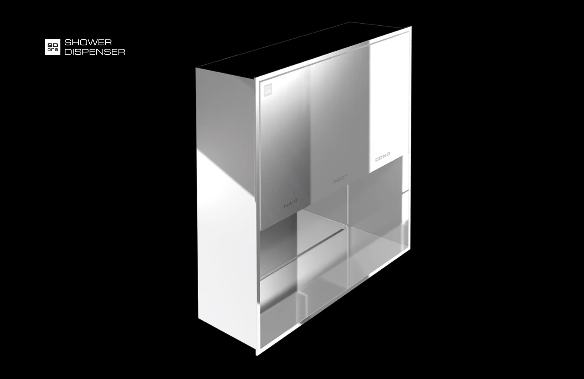 Shower Dispenser SD.ONE is a worldwide patented lotion dispenser with integrated filling containers and invisible sensor technology for up to 3 types of shampoos, conditioners, or shower gels. With an external dimension of 35 x 35 cm and an adjustable frame for different wall covering material thicknesses, it can be installed flush with the wall in a wet area. The user simply places their hand under the product they want to use, and they receive a perfect predefined amount of SHAMPOO, CONDITIONER, or SHOWER GEL.
